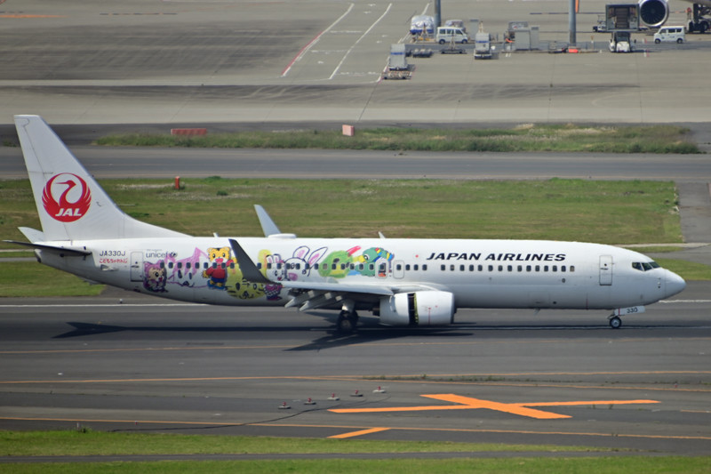 ベネッセホールディングの「こどもちゃれんじ」の30周年を記念したプロジェクトの一環として特別塗装機の「しまじろうジェット」を就航させていて、羽田空港のA滑走路に着陸してきた所を撮影しました。