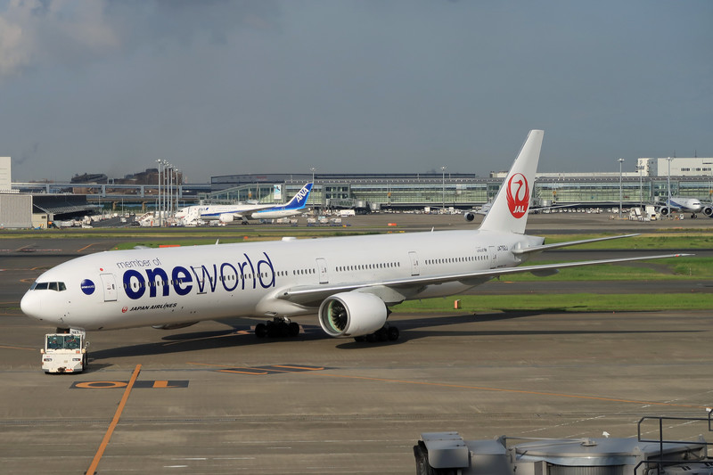 JALの最大クラスのトリプルセブンのワンワールド塗装機がプッシュバックされていく時の画像です。