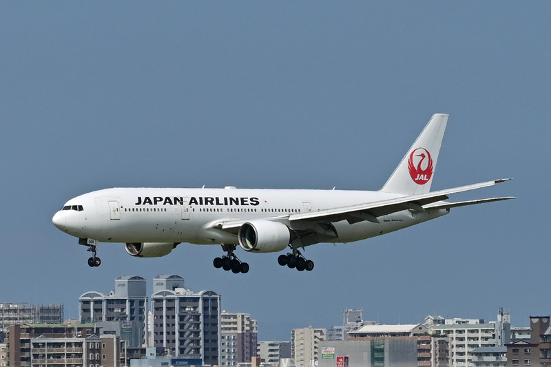 JALのトリプルセブンの着陸シーンです。たぶん羽田からの便で航空需要が多いので最大のキャパの機材が充当されています。