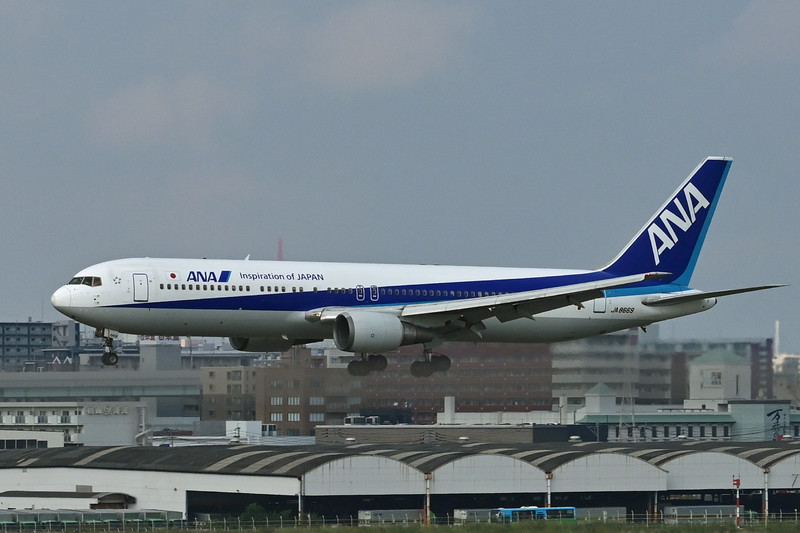 福岡空港にANAの767が着陸して来ました。 市街地のまん中にあるのでバックも家などが沢山見えます。