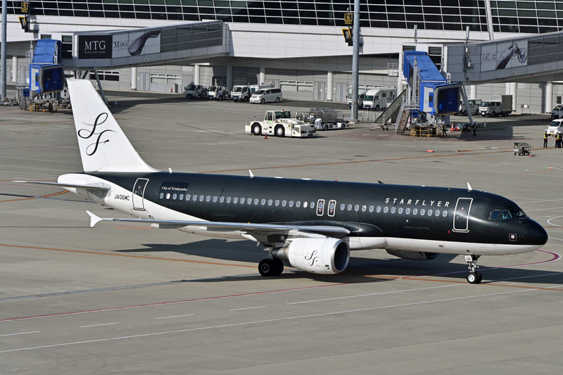 黒塗装が珍しい航空会社のスターフライヤーで羽田でも見かけるが晴天の下で見るととてもシックでいい感じです。