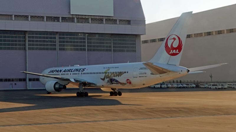 JALの特別塗装が整備場エリアに駐機していたのでD滑走路に向かう機内から撮影しました。 日本文化、芸術の魅力を国内外に発信する『日本博』特別塗装機で、「美しい日本」「美術」「舞台芸術」「被災地復興」などの8つの分野がデザインされています。 2020年3月から継続している特別塗装で、Oneworldなどの特別塗装をのぞけば長い期間に渡っています。