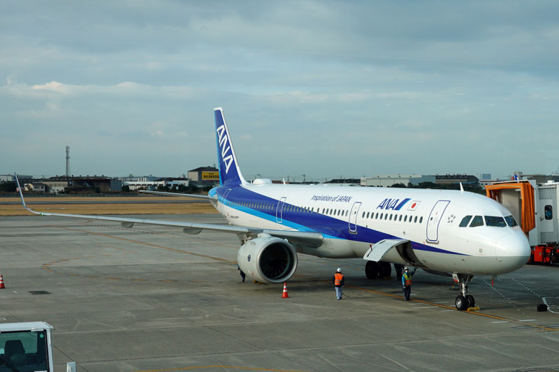 羽田から松山空港に来た時に隣のスポットに駐機していた機材です。 ANA583便として乗って来たJAL431便と同じ時間帯ですぐ後ろを飛行して来た便でボーディングブリッジがつけられる所です。