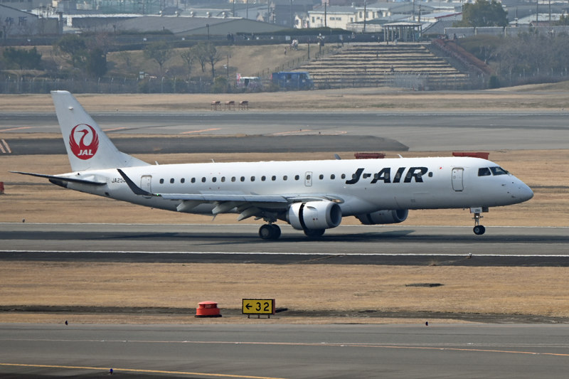 JALグループの中距離路線を担当するJ-AIRは大阪国際空港がベースなので数多く見かけます。着陸して前輪が着地する前から逆噴射です。