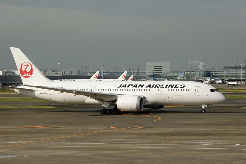 日本航空の787が移動して行きました。奥の国際線エリアにはJALが並んでいて尾翼のバークが見えますね。