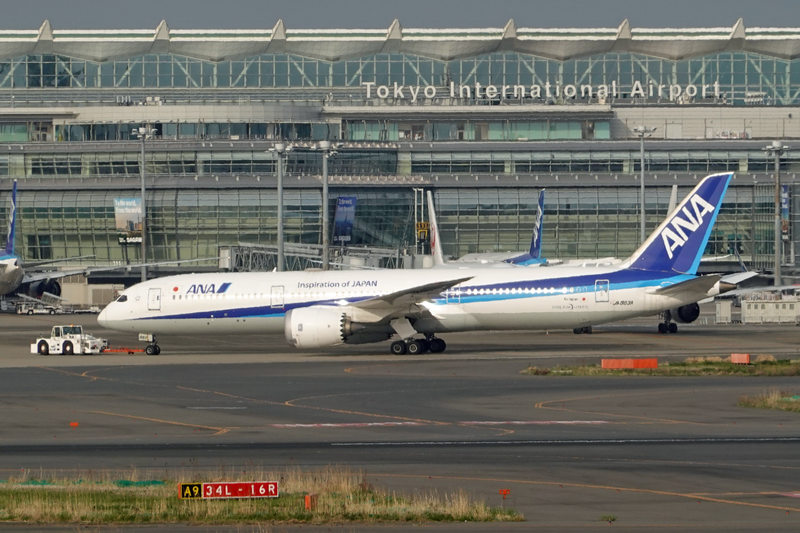 ANAの787が国際線のエリアを牽引されていきました。 全部のドアの間の窓が2つのグループに分かれているので-9か-10なのですが数が違っているので-9ですね。