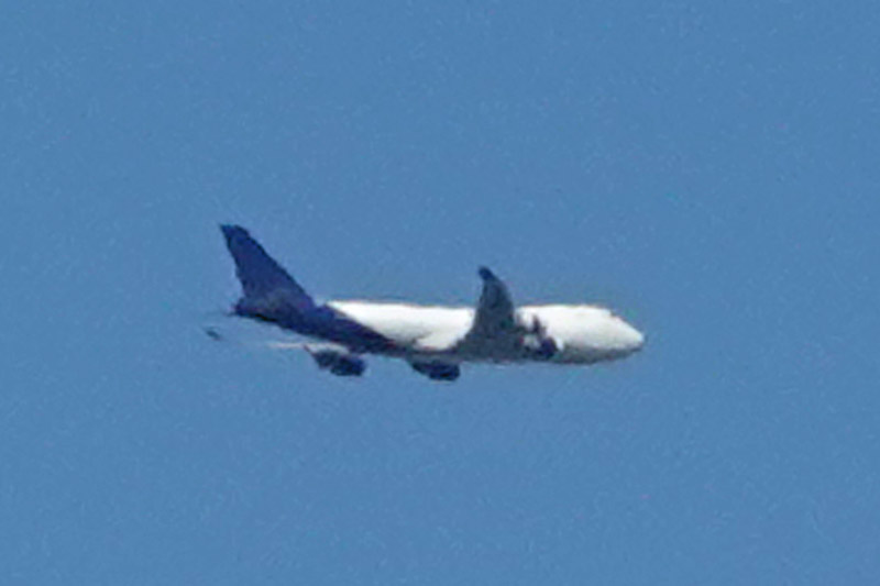 アメリカのアンデルセン空軍基地から東京の横田基地への貨物輸送で飛行してきや機材で、かなりの高度で遠くだったのでハッキリとは写りませんでしたが、Flightrador24で情報入手して特定しました。