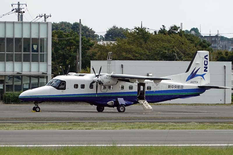 ターミナル前に駐機していた新中央航空の機材。タラップが降ろされ搭乗直前か到着後の降機か
