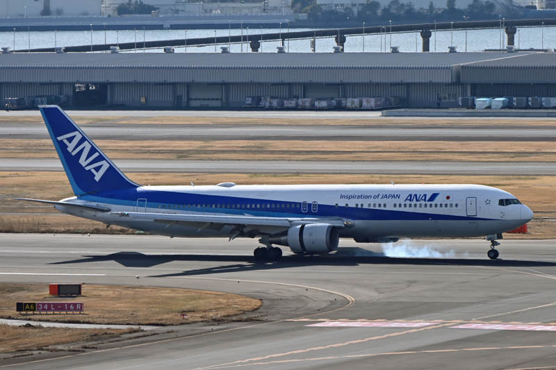 ANAの767が羽田空港のA滑走路に着陸して、前脚が着地してスモークを上げているところです。