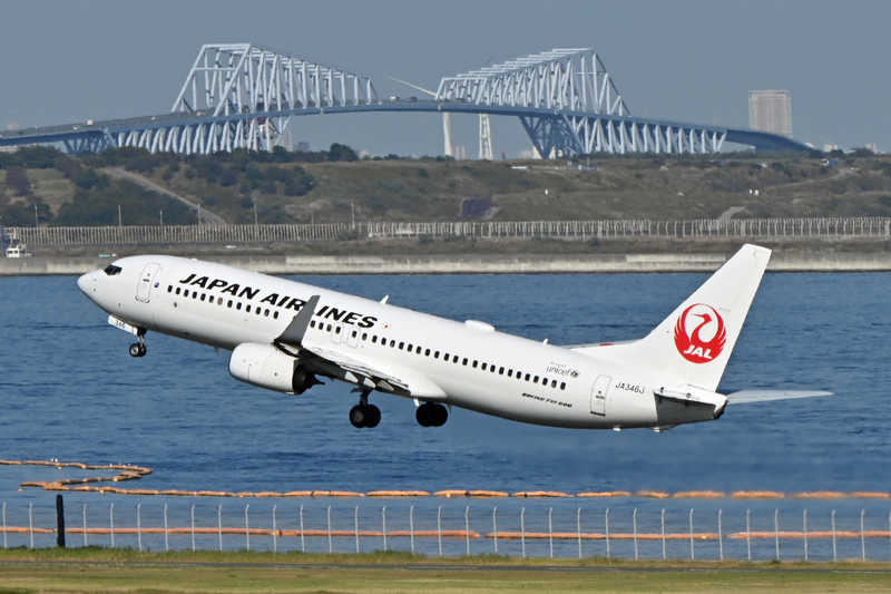 JALの小型機の737の離陸シーンで羽田空港のC滑走路からの離陸でしたので後ろの東京ゲートブリッジと絡めてみました。