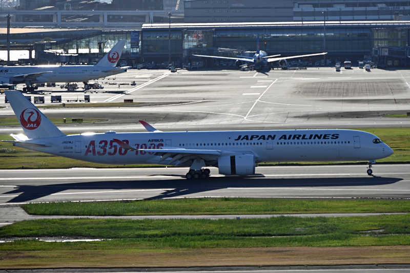 JALのトリプルセブンに代わる長距離国際専用の機材のA350の長胴型の着陸風景です。初号機はボディに文字が書いてありますがダッシュ900との見分け方は主客が3列がダッシュ1000で2列がダッシュ900です