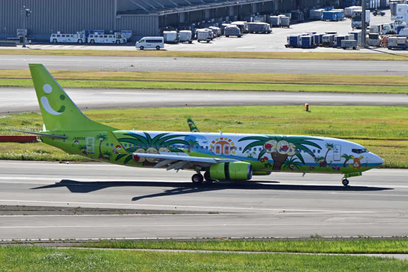 ポケモンの「ナッシー」と「アローラナッシー」などが描かれた、ソラシドエア初の全面特別塗装機が羽田のA滑走路に着陸してきました