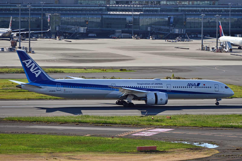 ANAの787が羽田のA滑走路に着陸して逆噴射をして減速しています