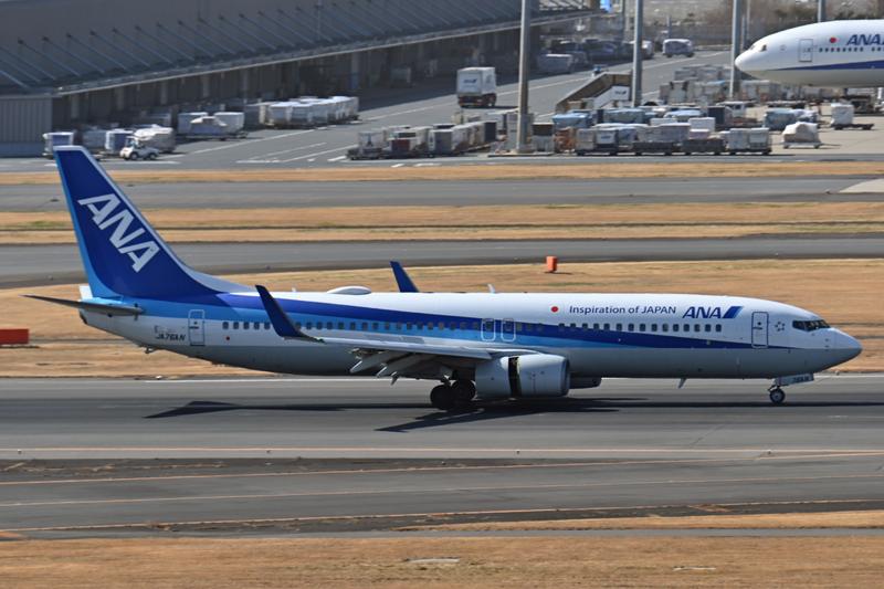 ANAの737でウィングレットが青一色の機材が羽田空港のA滑走路に着陸してきました