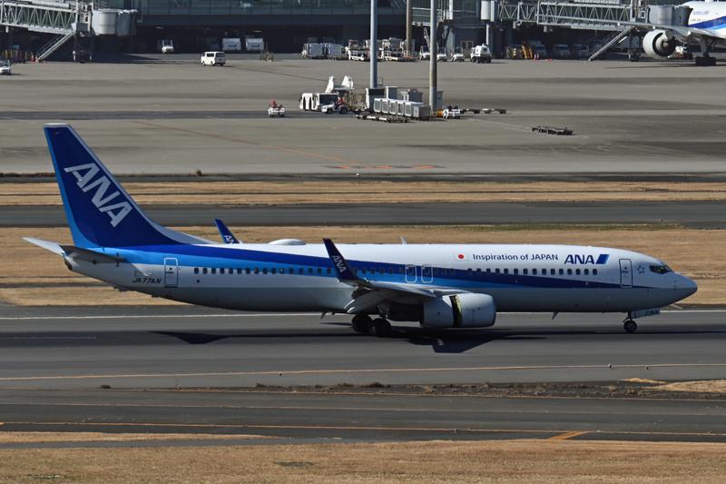 ANAの小型機の737が羽田のA滑走路に着陸して逆噴射しています