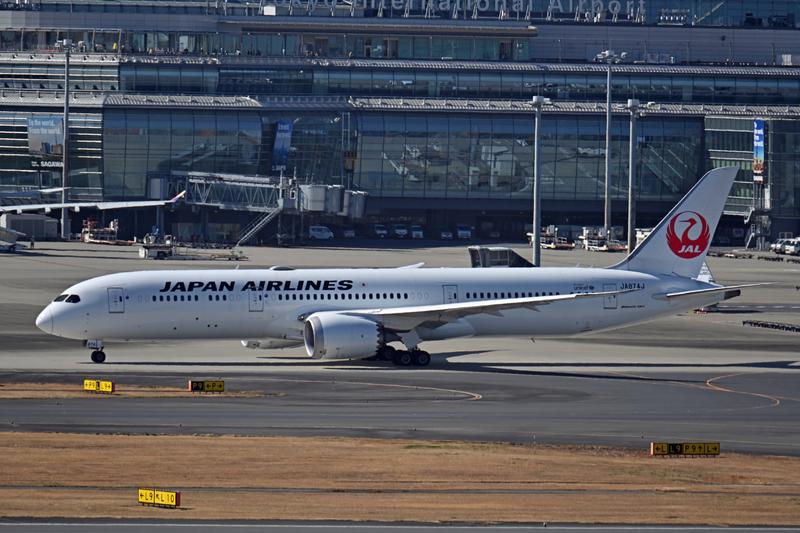 JALの787が国際線ターミナル前の誘導路を移動していきます。国際線仕様なのでしょうか