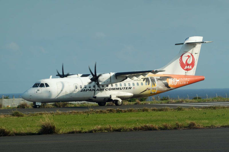 沖永良部島の観光旅行の帰りに搭乗待合室で待っているときに帰りに乗っていく機材が着陸してきました。但馬空港に関連するコウノトリが描かれた特別塗装機です