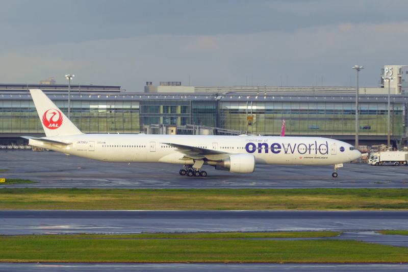 国際線のトリプルセブンでワンワールド特別塗装機がT3に向かって移動していきます