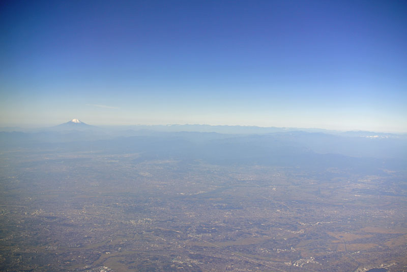 広大な関東平野の向こうに富士山が見えるアングルで撮影しました。北に向かう便なので徐々に小さくなりこのあたりが見える限界でした。