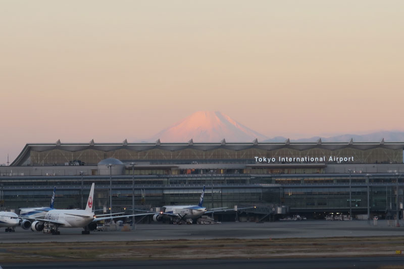 冬の早朝の便に登場するときにJALラウンジから撮影した写真で日が登り始めたばかりなので富士山は少し赤みを帯びています。