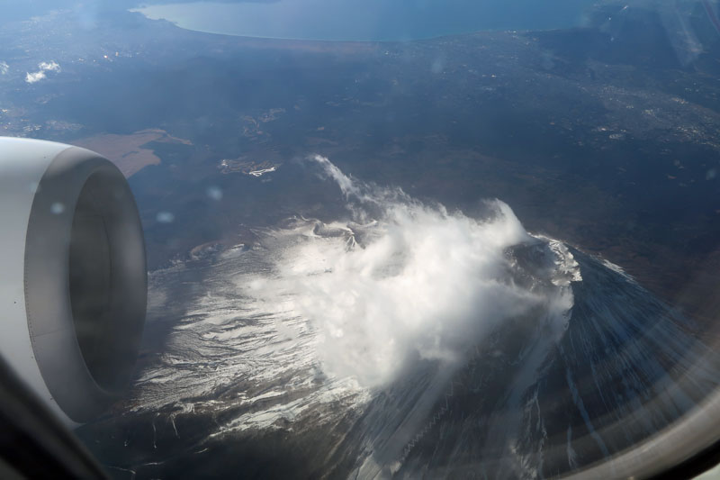 富士山の真上を飛ぶY28ルートでしたが少し北側になりかろうじて富士山が見えました。真下に近い角度なので窓の映り込みがあります。