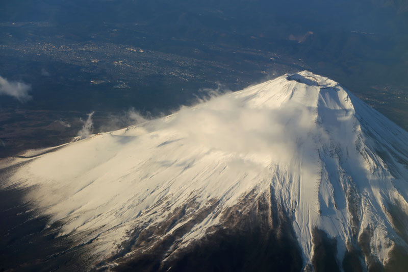 富士山の近くまで来た時に撮影した写真で、もう少しで真横を通過します。羽田から熊本空港への便は富士山の真上を通るY28のルートなので見えないのが常ですが少し北側なのでギリギリ見る事が出来ました。