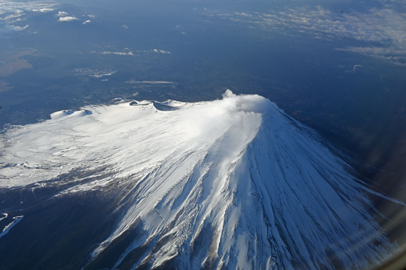 羽田空港から松山空港に向かう便の機内から撮影した写真で、富士山の北側を飛行します。頂上は雪煙でその左側に大きな宝永火口が見えています。