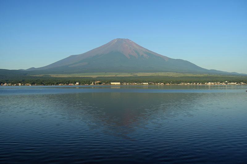 グループツーリングの日は富士山は雲に隠れてほとんど見えませんでした。そこで翌朝の早朝に湖畔まで自転車で走って見に来たら雲もなく綺麗に見えました。