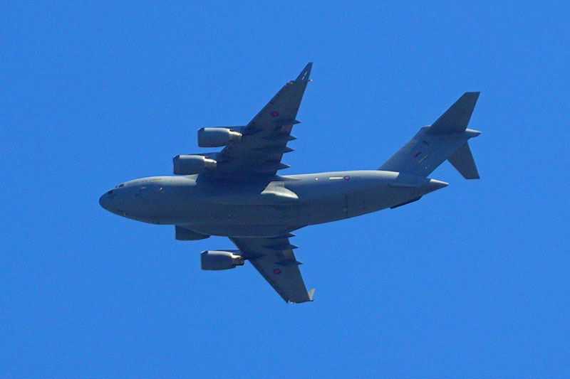 境川サイクリングロードから飛行中のアメリカ空軍の輸送機を撮影