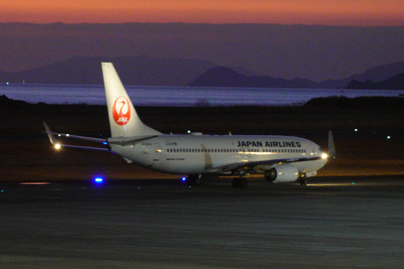松山旅行の帰りに展望デッキから離陸に向けて移動していくJALの737を雰囲気を重視して撮影しました
