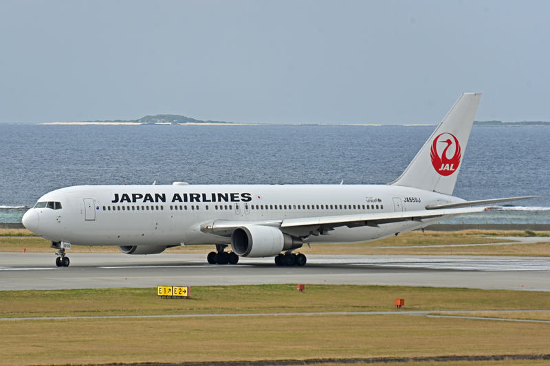 那覇空港から離陸するJALの中型旅客機です。那覇〜羽田はA350が増えましたが767で運航する便もあります
