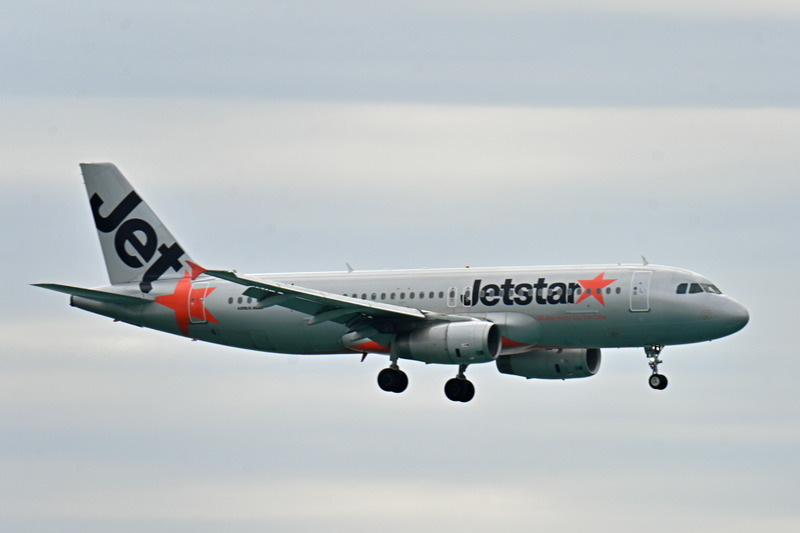那覇空港に着陸するジェットスタージャパンの機材を瀬長島 ウミカジテラスで撮影しました