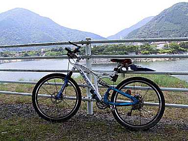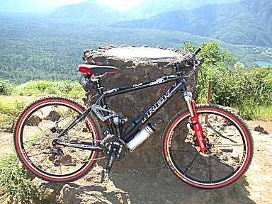 【2世代目 MTB】 メーカー:プジョー 型名 :VTT−905 改造 :ホイールをシマノの完組みに駆動系はシマノのディオーレ。ブレーキをシマノのディオーレ 約11年の時の経過はすさまじかった。2世代目のMTBはフルサスでディスク仕様であった。 フレームはアルミであったが重量はかなりあり16kgを優に超えていた。 結局、山を走るには重すぎたため3代目のMTB(フレーム購入)し、引退した。 その後YAHOOのオークションで買い手がつき余生を送っている。 撮影場所:丹沢湖 |