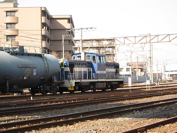京急の大師線の終点の小島新田駅の先にで入れ替え作業を行っていた神奈川臨海鉄道のDD55型機関車です。 全体的なフォルムはディーゼル機関車に共通なものですが、JR貨物などにはないオリジナル車です。