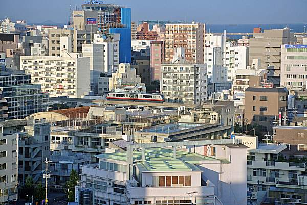 宿泊したJALシティ那覇の部屋から那覇の町並みの中を走るゆいレールを撮影していました。