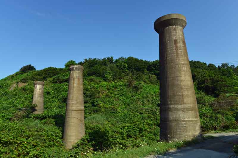 松前線は松前駅までは作られそこから先はマンガンを運ぶために太平洋戦争時代に路線計画があり作られたものですが未完成のまま終わりました。この場所には橋梁の柱が残っています。 この上に鉄橋が乗せられるのでしょうが未成線なので柱だけ作って終わってしまったのかも知れません。