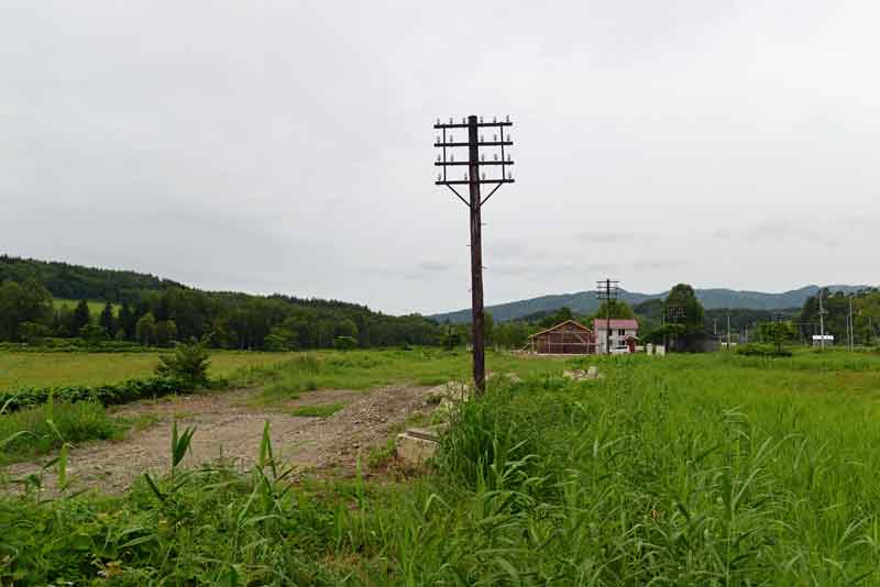深名線の廃線跡は大きなものから小さなものまでたくさんあります。天塩弥生駅跡の近くには、この通称「ハエタタキ」と言われている通信用の電柱でしょう。 簡単に撤去できるはずですが向こうにも一本見えます。