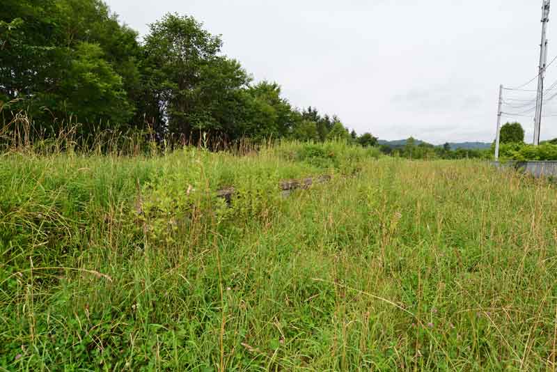 廃線になってかなりの年月が経つので道路も埋もれ駅もプラットホームの一部が草からやっと見える状態です。