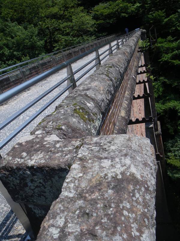 通称:めがね橋自体も鉄道遺産ですが、その橋の横には通信線などを保持したと思われるバーが出ていますが、ラック式のレールを再利用したものらしいです。