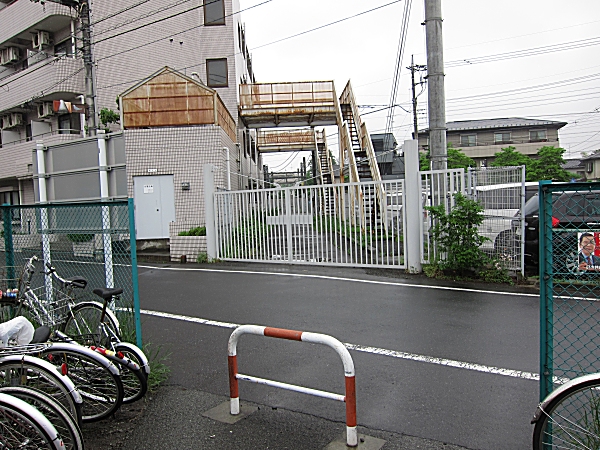 さらに歩いて行くと道路を横切った先はゲートがあり入る事ができません。 建物から線路をまたぐような通路がある建物にも特徴があり、鉄道総合技術研究所の独身寮だそうです。