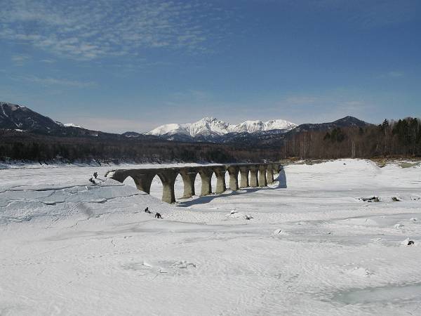 湖を渡った小高い丘の上からの橋の全景です。向こうに見える山は十勝岳とその付近の山々だと思います。 観光客も少なからず訪れていて、橋の下から眺めるために斜面を下っています。