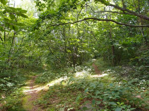 遊歩道は2手に分かれていますがカーブの感じから左側が廃線跡と推定できます。