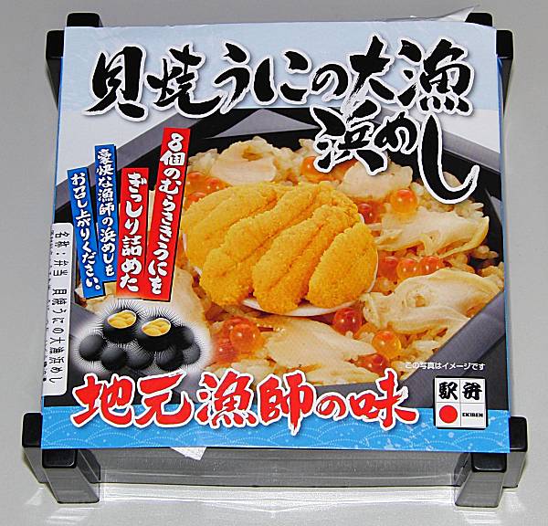 茶飯の上につぶ貝といくらのしょうゆ漬けが載っている弁当で、その真ん中にほっき貝のからにムラサキうにを詰めて焼いたものがドン!と載っています。
