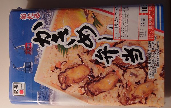 北海道では海産物が有名で、牡蠣をふんだんに使った弁当がこれです。 牡蠣の煮汁で炊き込んだ御飯にぷりぷりの牡蠣が載っていますがおかずが少ないので他に何か欲しくなります。