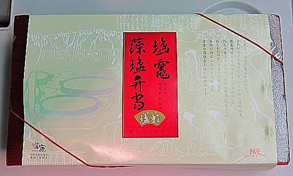 宮城県塩釜市にある藻塩焼神事にならって作られた『塩竈の藻塩』が入った弁当で、おにぎりタイプもあるようですが、こちらはひし形で区切られた中にぎっしりとおかずが入っています。 『塩竈の藻塩』は別の袋にぎっしりと入っていて使ってもよいし持ち帰ってもよいです。 出張の時に上野駅でゲットしました。