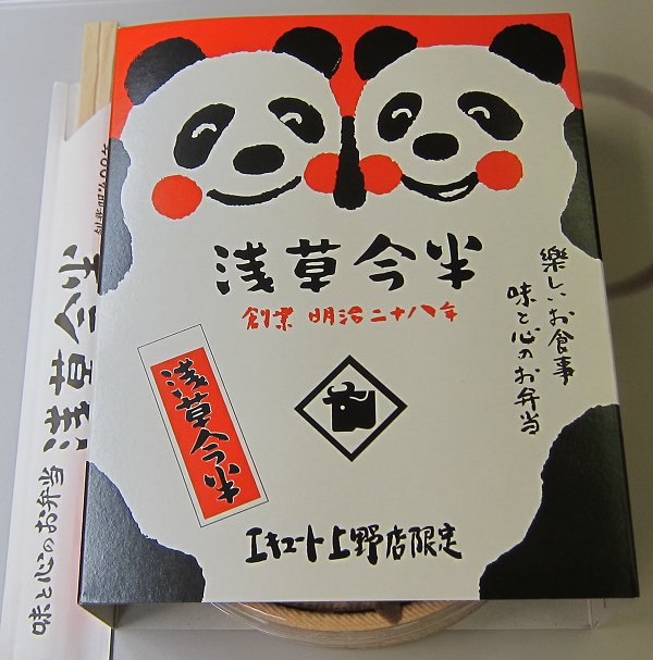上野駅の改造が終わりエキュートが生まれ変わった。 お弁当の種類も増え、通常の駅弁のほかにも購入が出来ることとなっています。 その中の一つがこれで、今半といえばすき焼きなどで有名でさめてもおいしい弁当ですが、価格が少し高めです。 パンダは上野のシンボルなのでパッケージもかわいいです。