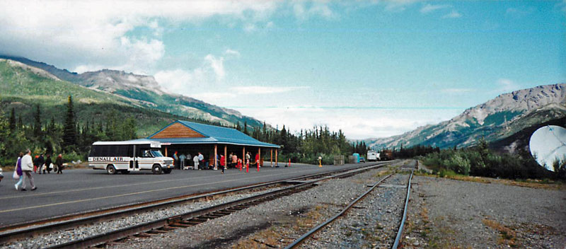 アラスカ鉄道の中間駅のデナリ駅です。 デナリ州立公園の最寄り駅になっていて、海外の鉄道に多くみられるプラットホームがないタイプの駅です。緯度が高いのでパラボラアンテナが水平に近い角度になっています。