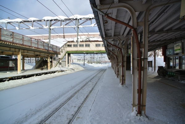 駅はプラットフォームまで雪が積もっています。