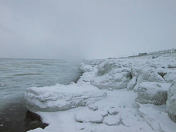 冬のオホーツク海は流氷が押し寄せ海と浜の境がわからなくなります。 この写真は丁度その境目から北浜駅を撮影したもので、右の中央から少し上に駅舎が見えるかと思います。 この場所は線路から浜辺まで距離がありますが駅舎のところはさらに近くなっています。
