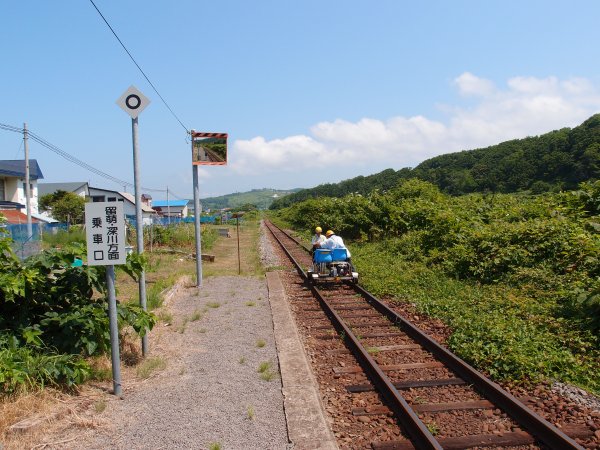 列車は来ない時間なのに列車のような音が聞こえてきました。 増毛駅のほうからエンジン付きのカートのようなものがやってきました。 舎熊駅で一時停車して線路を点検し、留萌方面に走り去っていきました。